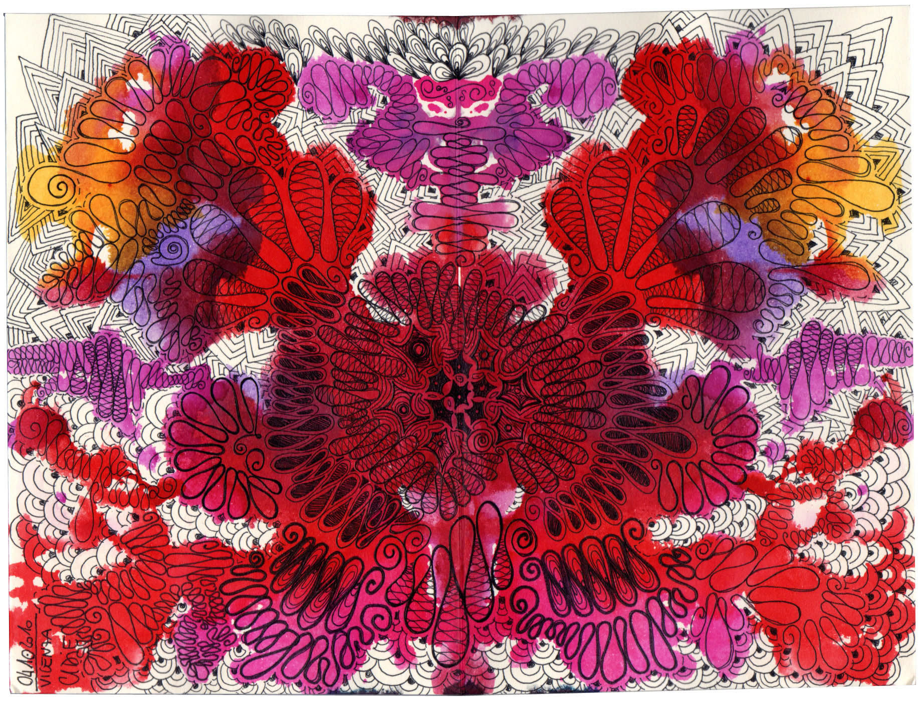 I'm synesthetic. This is the starting point of my experiment: using watercolors I produced these different colored spots, which represent different emotions and from this I developed the shapes of the drawings.